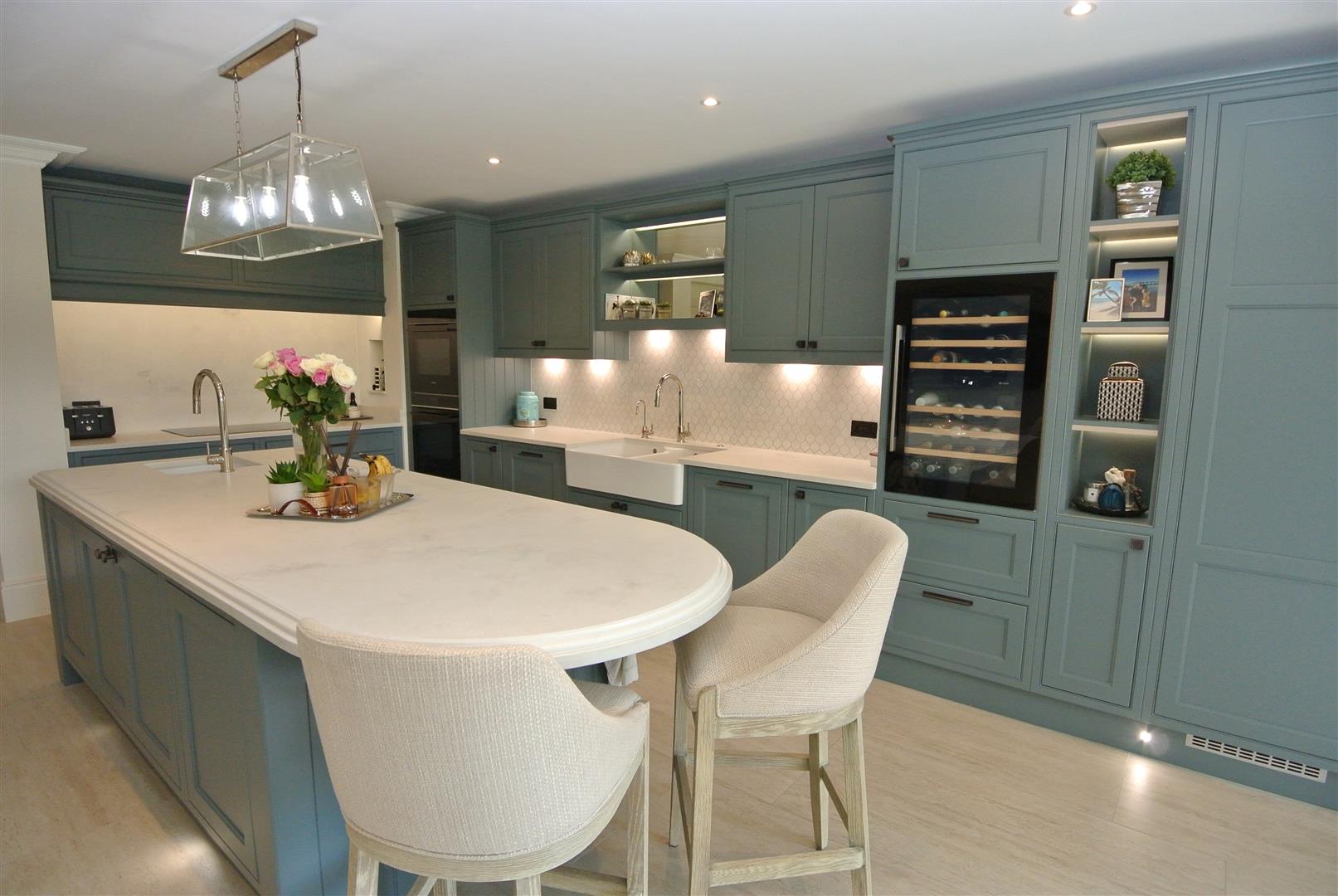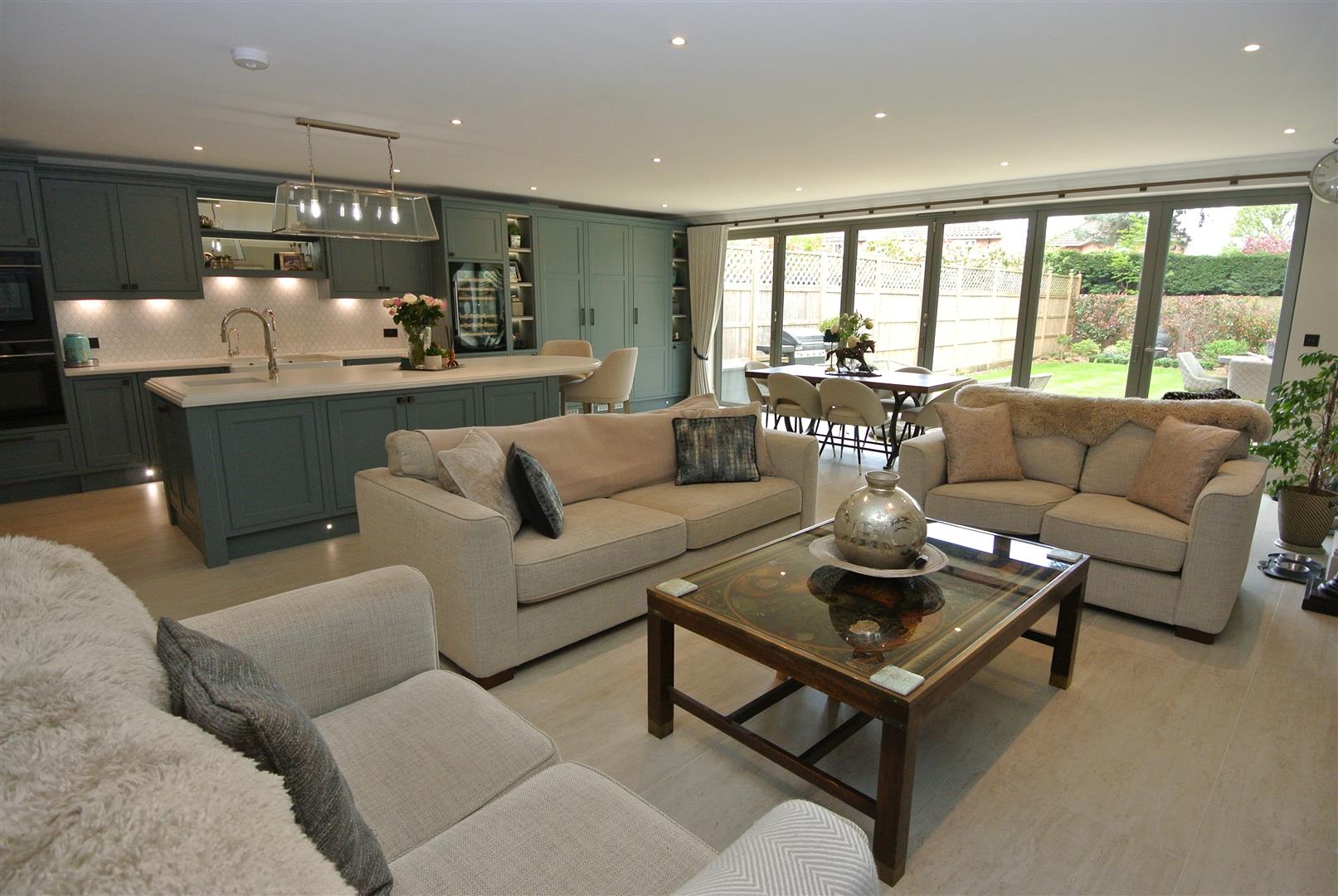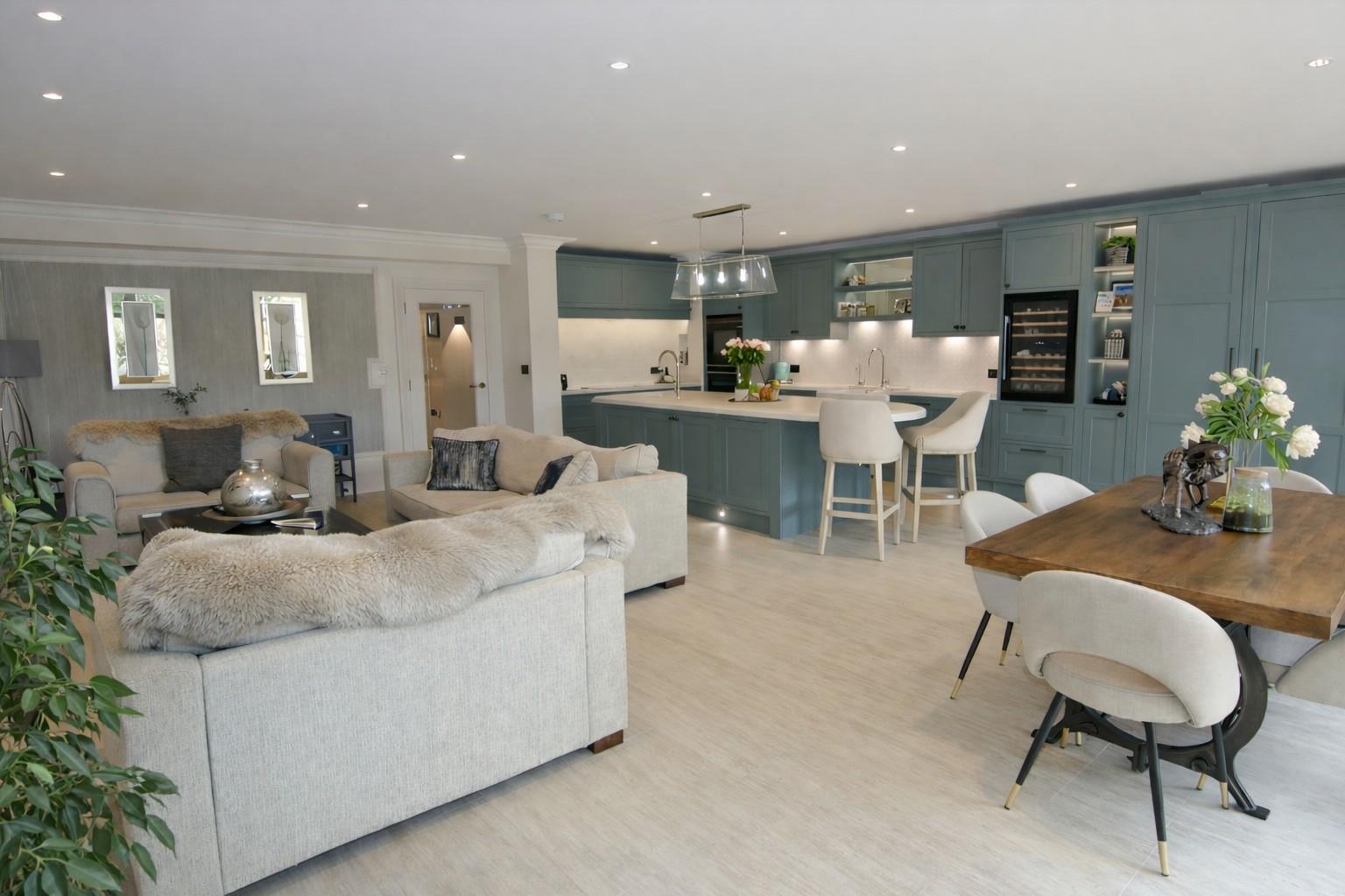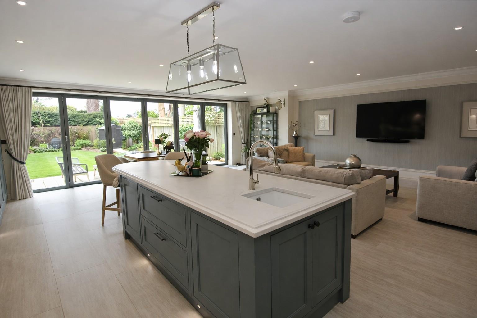 Properties built by Windsor Homes are renowned for their quality and attention to detail with many fine examples and happy customers in the village. This property comes with underfloor heating throughout via air source heat pumps, solar heating with storage battery which is linked to the electric car charging unit, good size garage, superb kitchen by Wooden Heart of Weybridge with Siemens appliances, full height Liebherr refrigerator and separate freezer, porcelain work tops and island unit with prep sink and Quooker boiling tap and a large wine refrigerator. In fact the kitchen/family/dining room is huge (approx. 650sq.ft.) with large floor tiles and 6m bi-fold doors which lead onto the secluded rear garden.