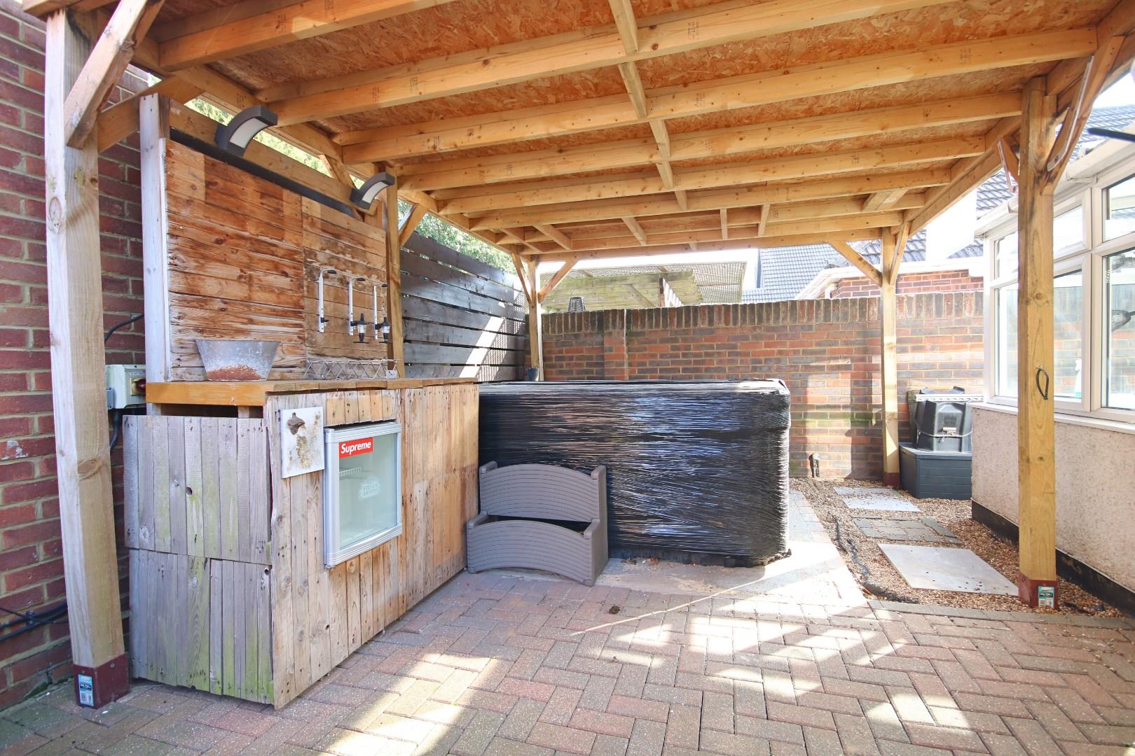 The accommodation includes three double bedrooms, all with fitted wardrobes, a spacious living room with feature fireplace, kitchen/breakfast room, conservatory, and a modern refitted bathroom. To the rear, there is a private entertaining area with a built-in bar and wooden pergola, perfect for outdoor gatherings.