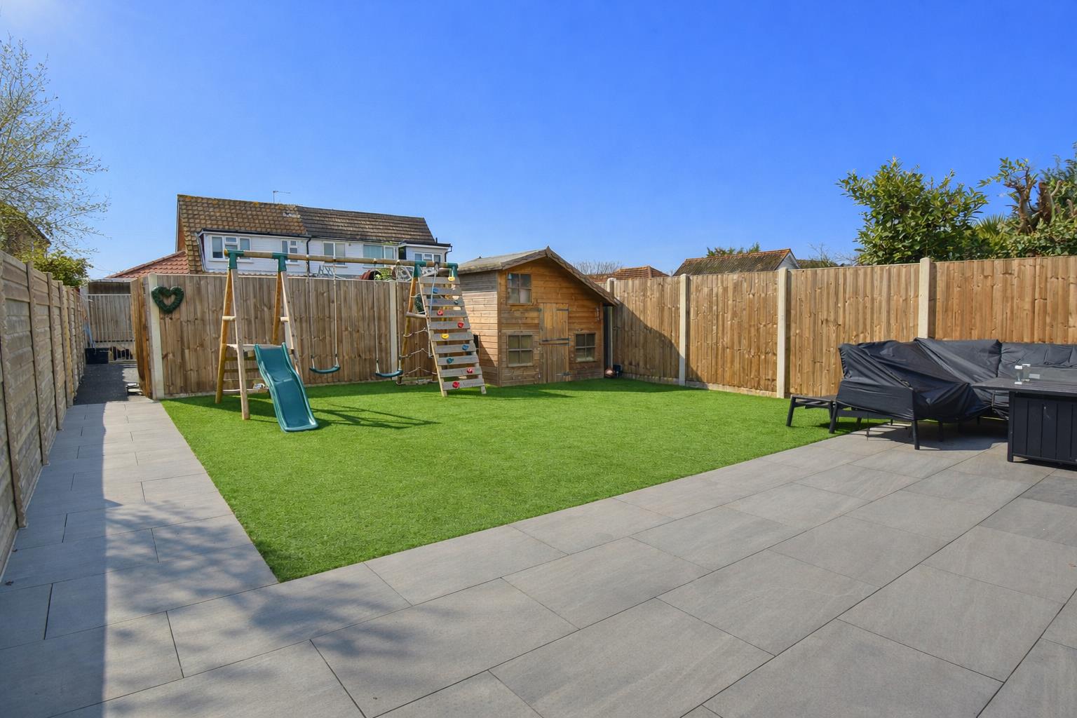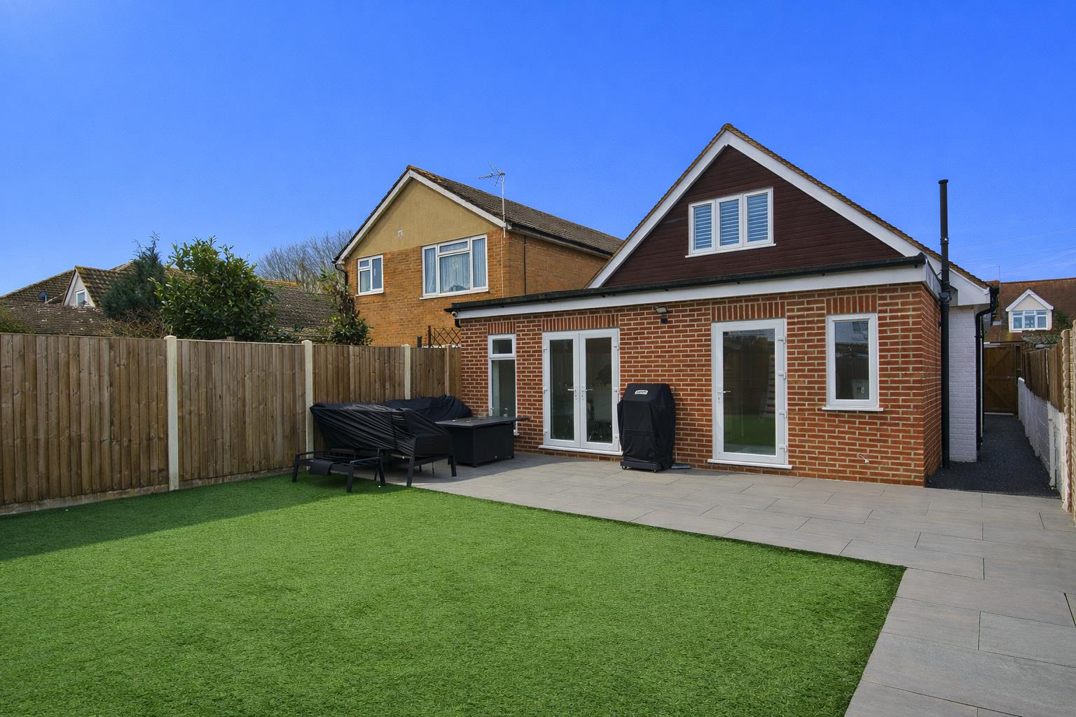 - Generous rear garden approx. 23m (75ft) with patio, double-gate access and additional hard-standing area