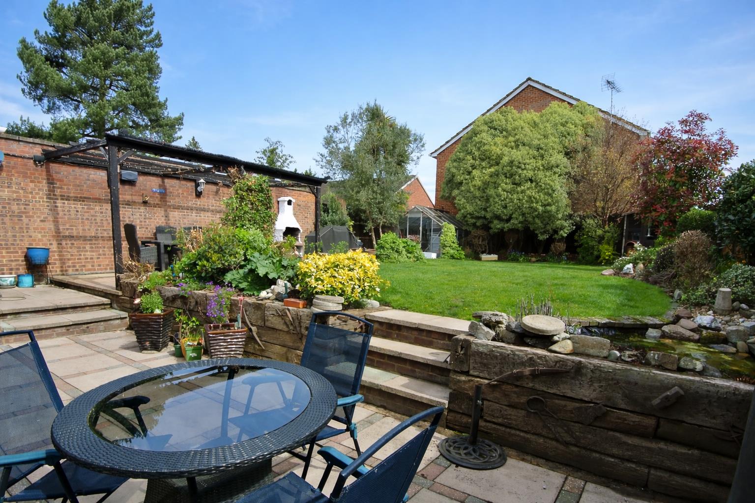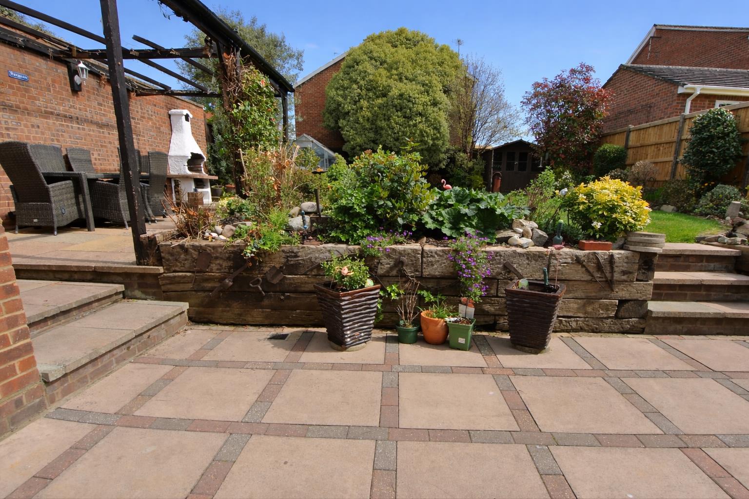 To the rear, a delightful garden provides a peaceful retreat, featuring a patio seating area, mature planting, and a lawn - perfect for relaxing or entertaining during the warmer months.