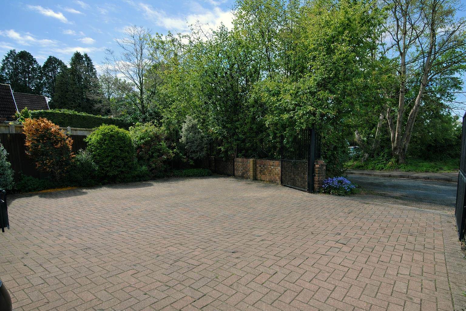 Set behind secure gates, the property welcomes you with a generous block-paved driveway providing ample off-street parking and access to a detached garage.
