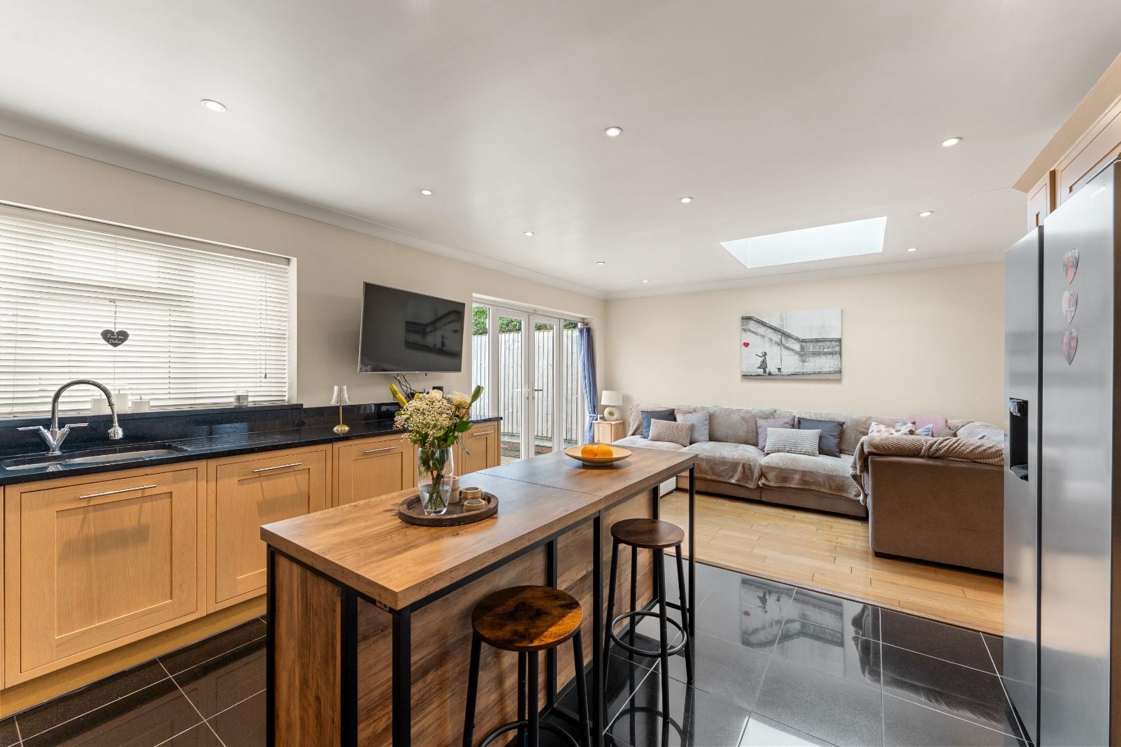 Nestled in a peaceful cul-de-sac and backing onto open playing fields, this beautifully presented three-bedroom, two-bathroom extended semi-detached family home offers generous and versatile living accommodation throughout. The property features two spacious reception rooms, one of which has previously been used as a fourth bedroom, providing flexibility for growing families or home working. The heart of the home is the impressive open-plan kitchen/diner, complete with a large central island, granite worktops, and modern fittings—perfect for both everyday living and entertaining. A practical utility room with a shower and butler sink adds further convenience.