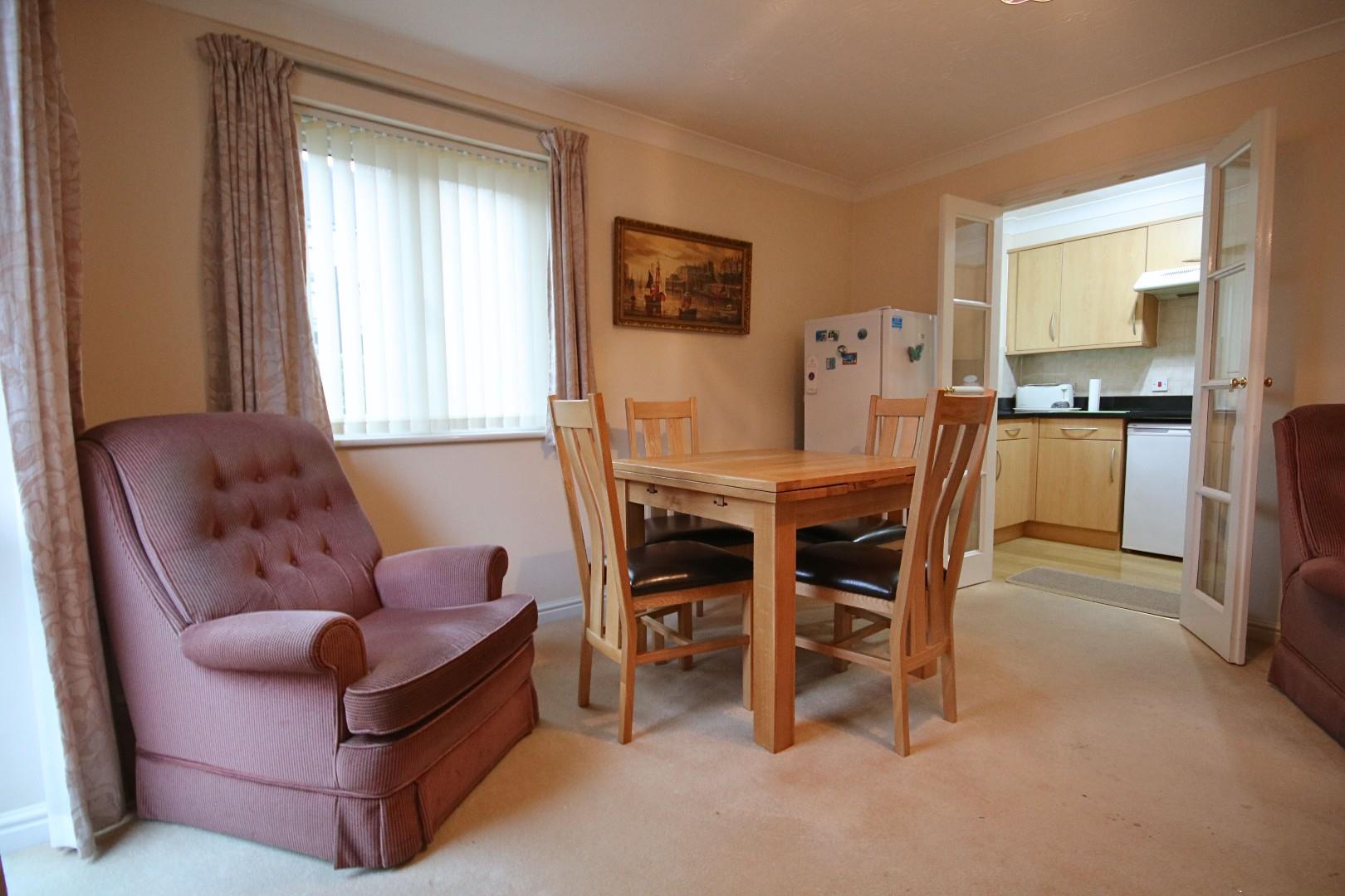 The accommodation is bright and well-proportioned, featuring a generous open-plan lounge leading through to a dining area, creating a comfortable and sociable living space. The kitchen is fitted with a range of units and includes space and permission for a washing machine. There are two good-sized double bedrooms and a well-appointed shower room. Residents of the development benefit from excellent communal facilities, including a welcoming residents’ lounge and well-maintained communal gardens, providing pleasant spaces to relax and socialise.