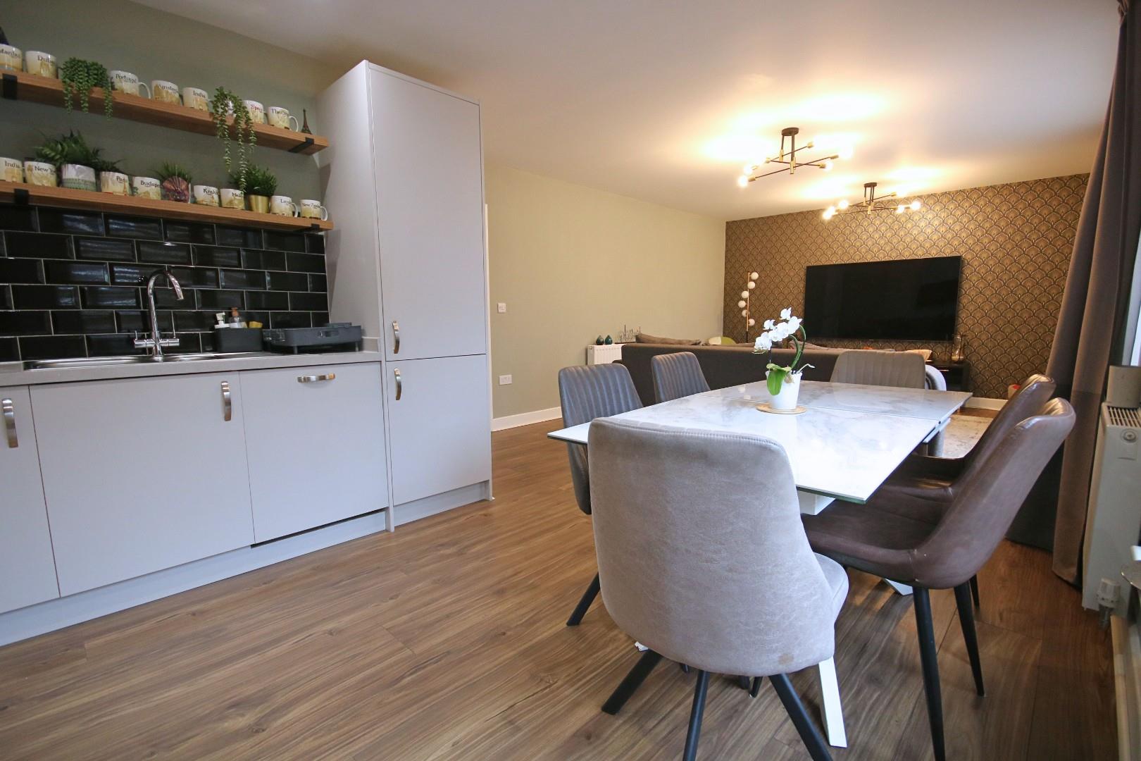 - Spacious open-plan lounge through kitchen with dining area